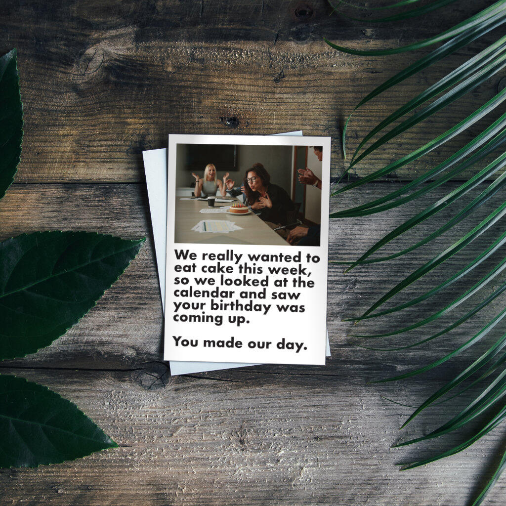 A line of greeting cards that say what you mean instead of hiding it behind awkward platitudes. We originally had them printed on-demand, but it wasn't really that quick so we closed the store until we get them printed for real. Here's an example birthday card since I don't have a project site set up:
